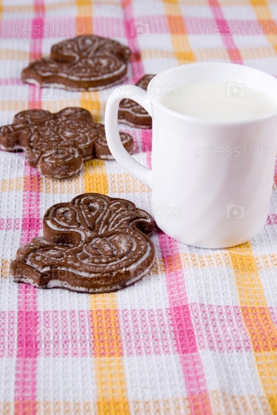 Кружка молока и шоколадное печенье на клетчатой скатерти