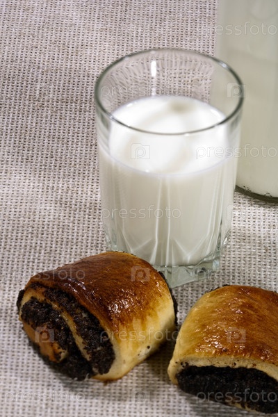 Свежее белое молоко с коричневой булочкой на столе