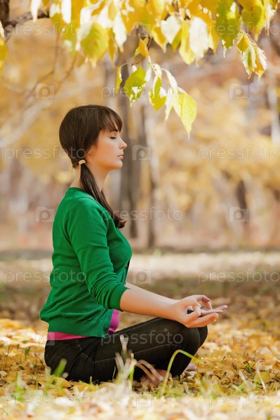 Красивая девушка занимается йогой в осеннем лесу