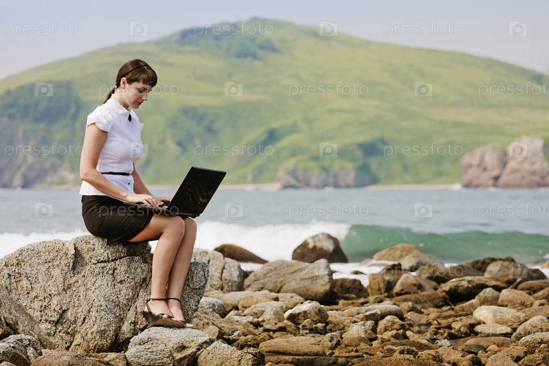 Красивая девушка в деловой одежде с ноутбуком на открытом воздухе