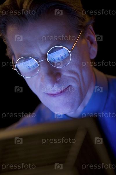 Мужчина в очках работает за компьютером