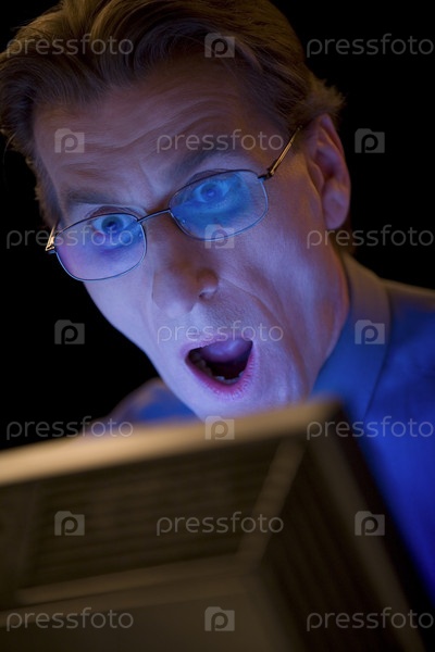Удивленный мужчина в очках работает за компьютером