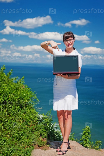 Красивая девушка с ноутбуком на открытом воздухе