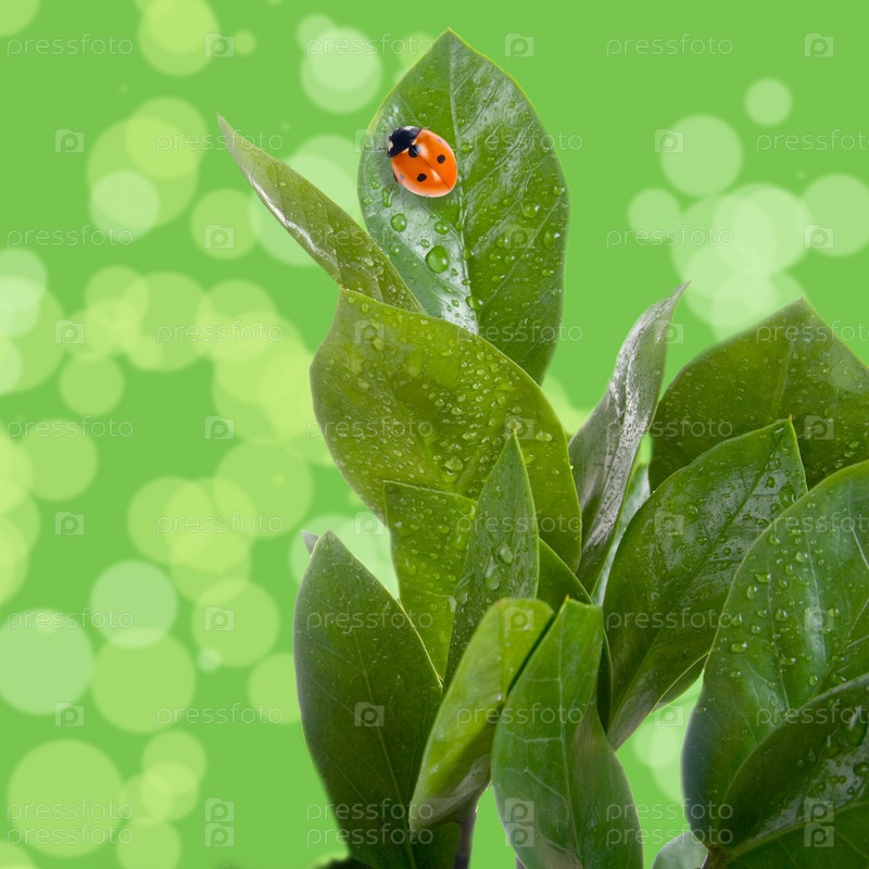 Влажные листья и божья коровка на зеленом фоне