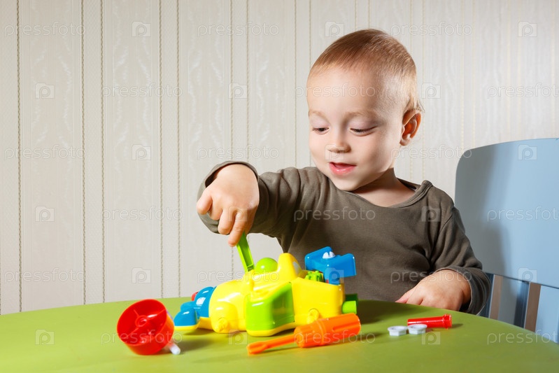 Маленький мальчик ремонтирует игрушечный автомобиль