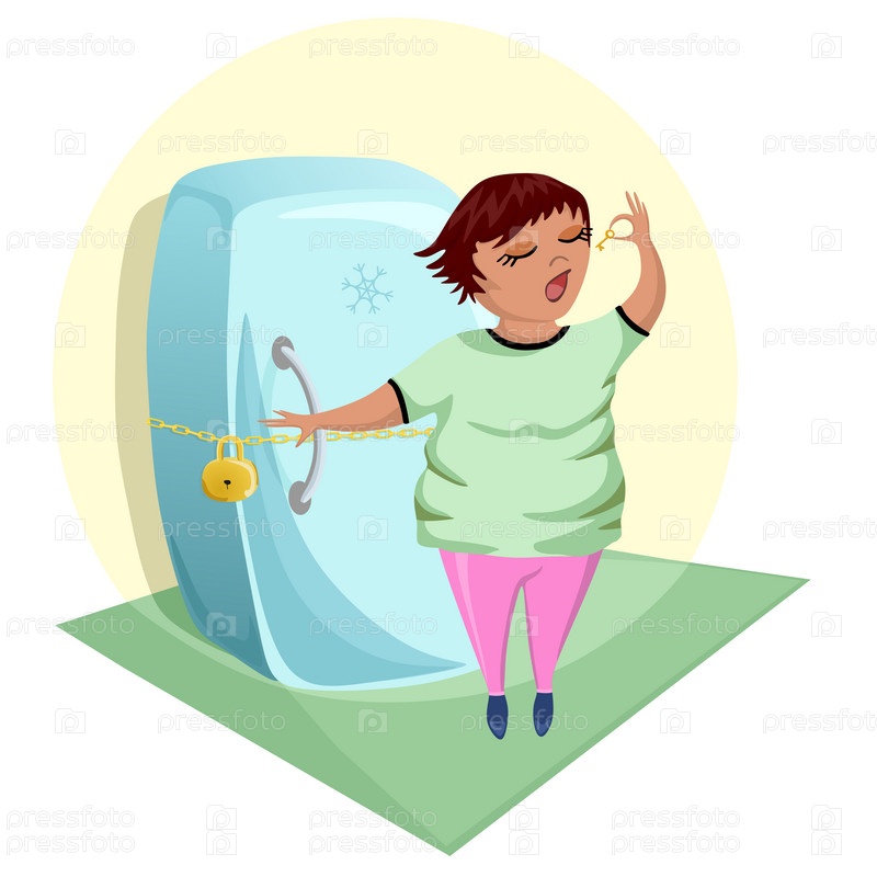 Женщина стоит возле запертого на замок холодильника