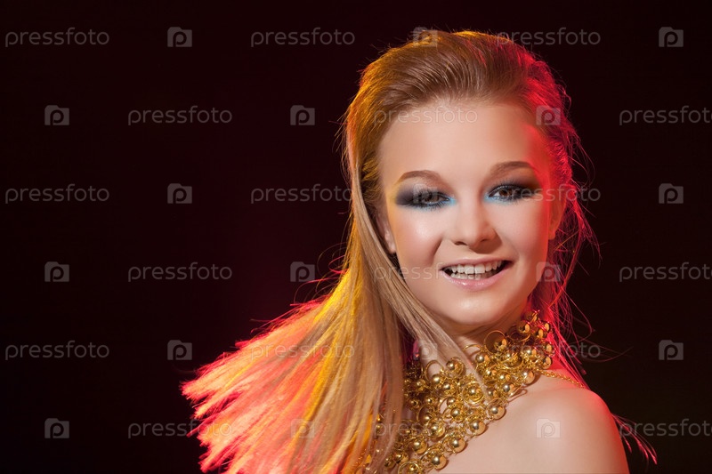 Веселая девушка с яркими волосами на черном фоне