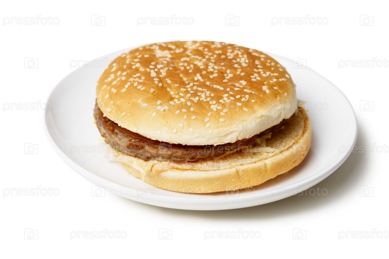 Сэндвич - гамбургер на тарелке, изолированной на белом фоне