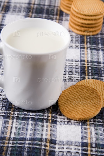 Печенье и кружка молока на клетчатой салфетке
