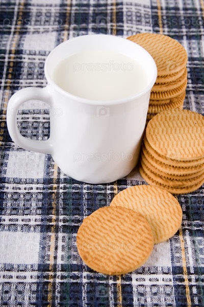 Печенье и кружка молока на клетчатой салфетке