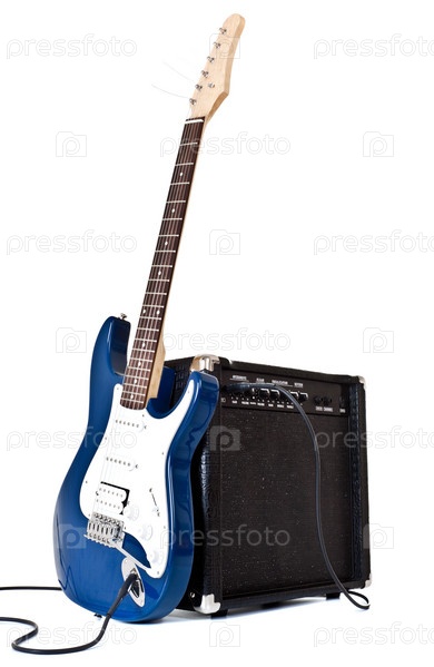 Электрическая гитара и усилитель изолированы на белом
