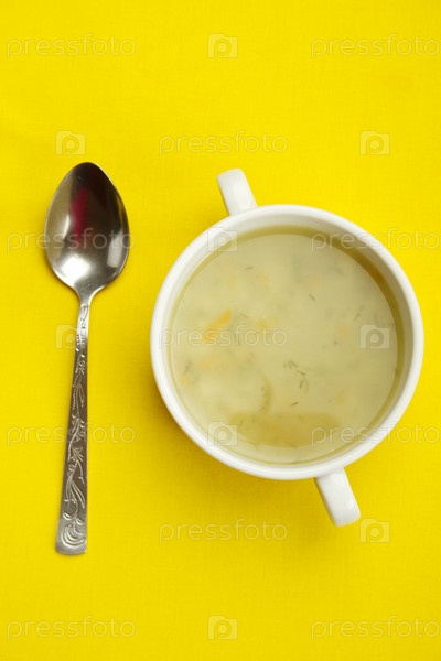 Тарелка супа и ложка на желтом фоне