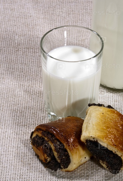 Свежее белое молоко с коричневой булочкой на столе