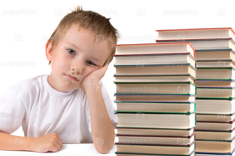 Мальчик сидит за столом со стопками книг