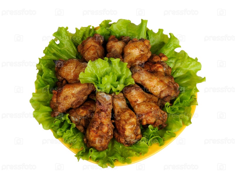 Куриные жареные крылышки на листьях салата на белом фоне