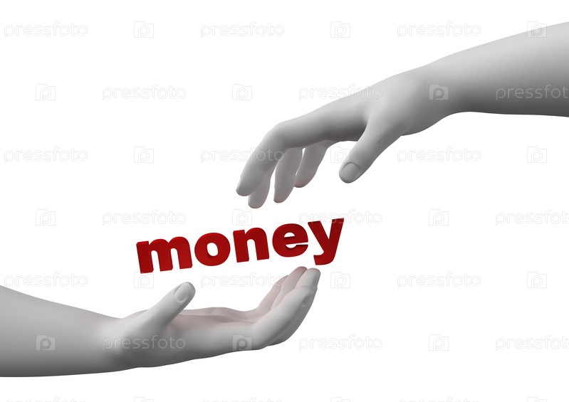 Две руки, протянутые к слову 'деньги'