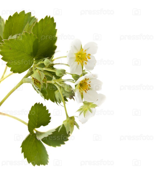 Цветы и листья земляники на белом фоне