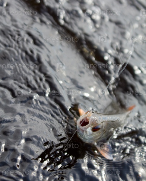 Рыба, висящая на леске над водой