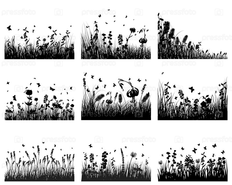 Черные силуэты растений, бабочек и стрекоз на белом фоне