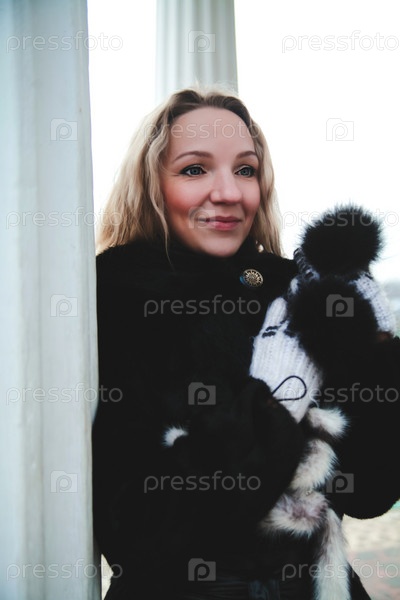 Женщина позирует возле колонн в парке