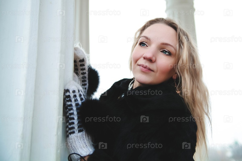 Женщина позирует возле колонн в парке