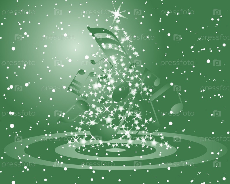 Новогодняя елка с музыкальными нотами на зеленом фоне со снегопадом