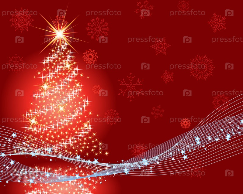 Новогодняя елка на красном фоне со снежинками