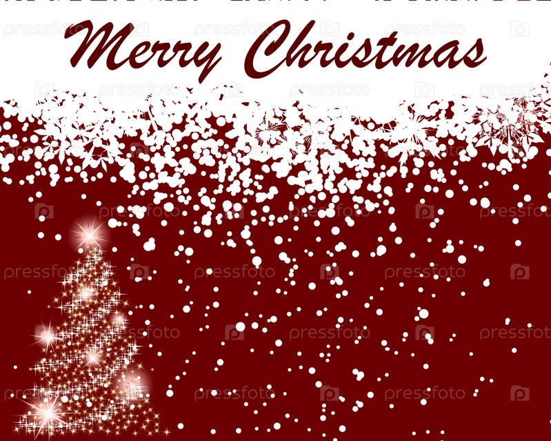 Новогодняя иллюстрация с елкой и снегопадом на темно-красном фоне