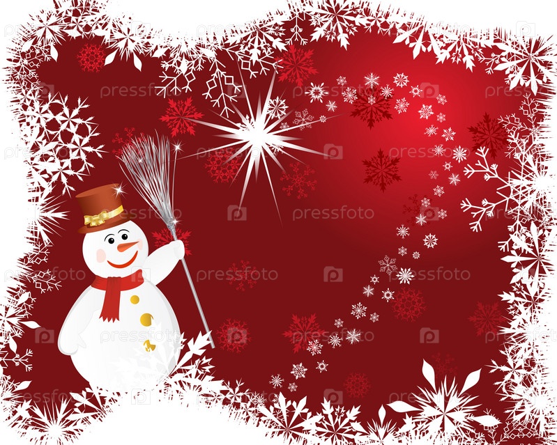 Новогодняя иллюстрация со снеговиком на темно-красном фоне