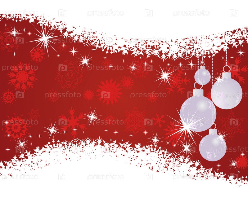 Новогодняя иллюстрация с елочными шарами и снежинками на красном фоне