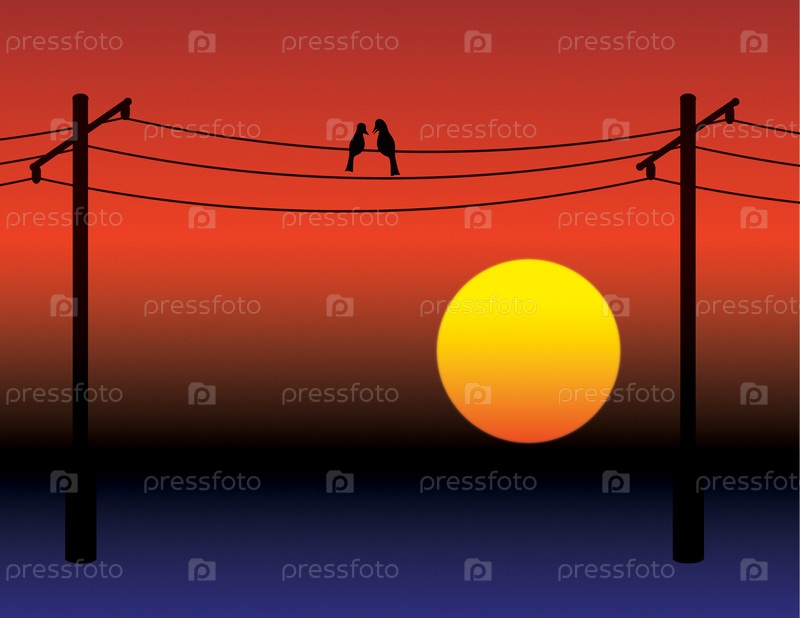 Птичье свидание на проводах на фоне заката