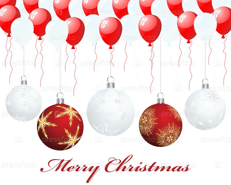 Красные и белые елочные украшения и воздушные шары на белом фоне