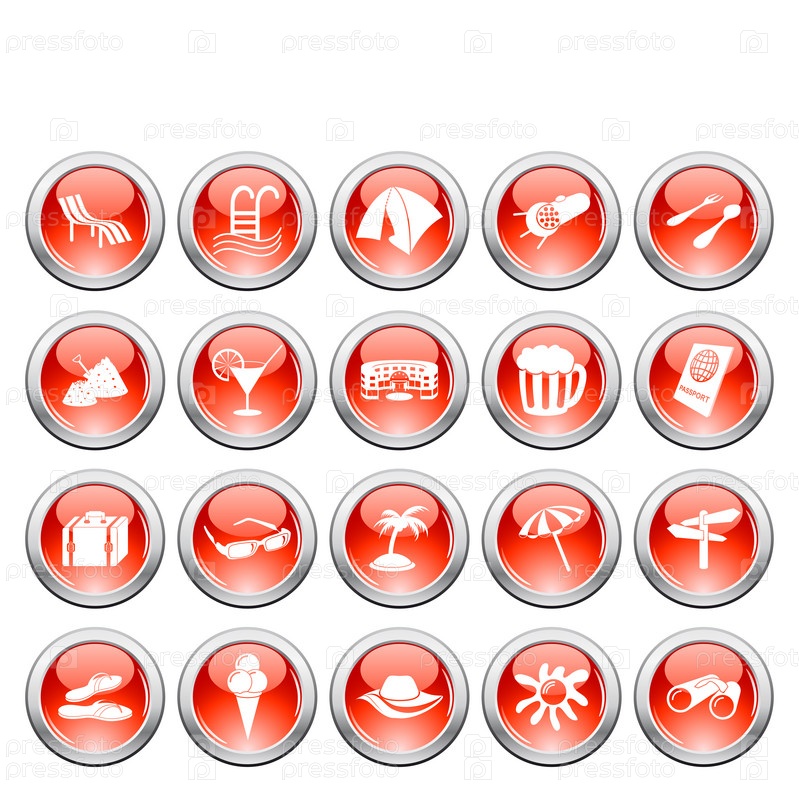 Набор красных кнопок с изображением атрибутов пляжного отдыха
