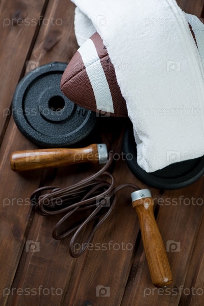Мяч для американского футбола, скакалка и блины