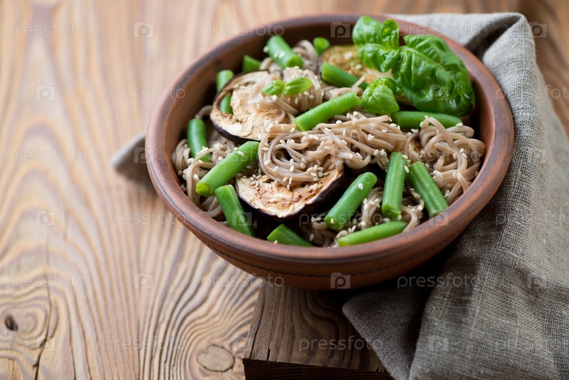 Гречневая лапша с баклажанами, фасолью и кунжутом