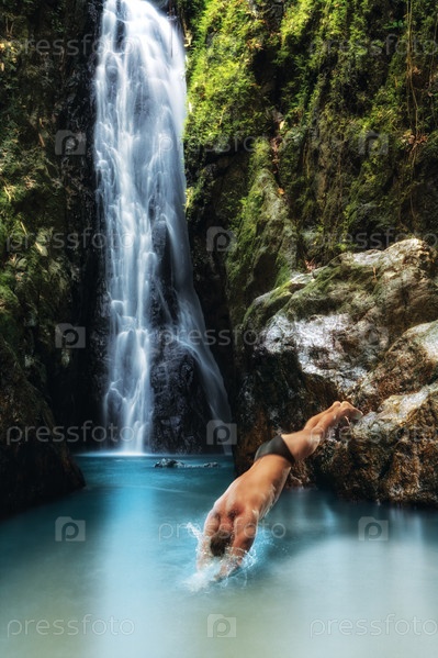 Мужчина ныряет в воду на фоне водопада