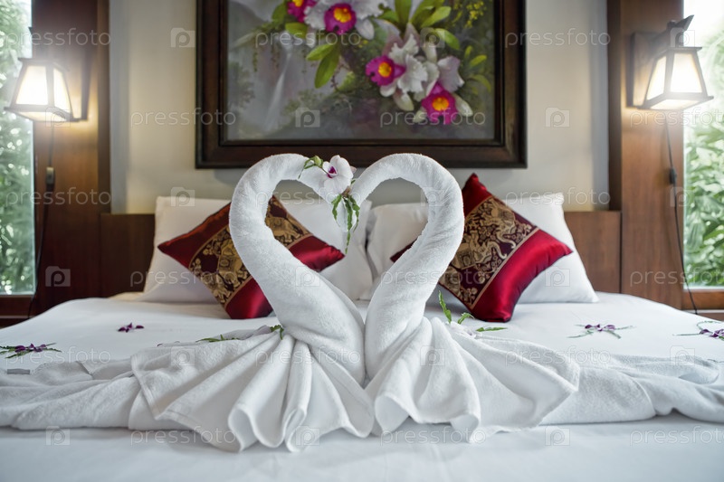 Украшение в виде двух лебедей на кровати в гостиничном номере