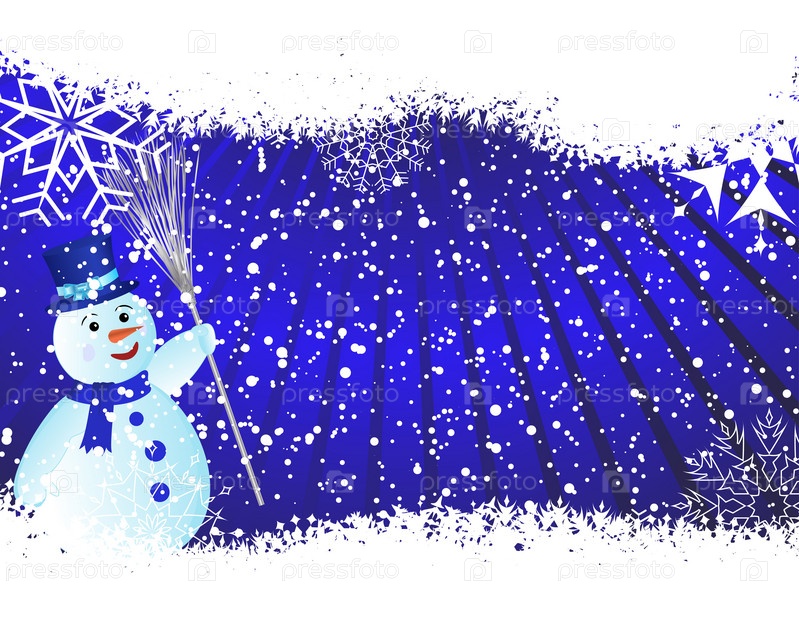 Снеговик на синем фоне со снежинками