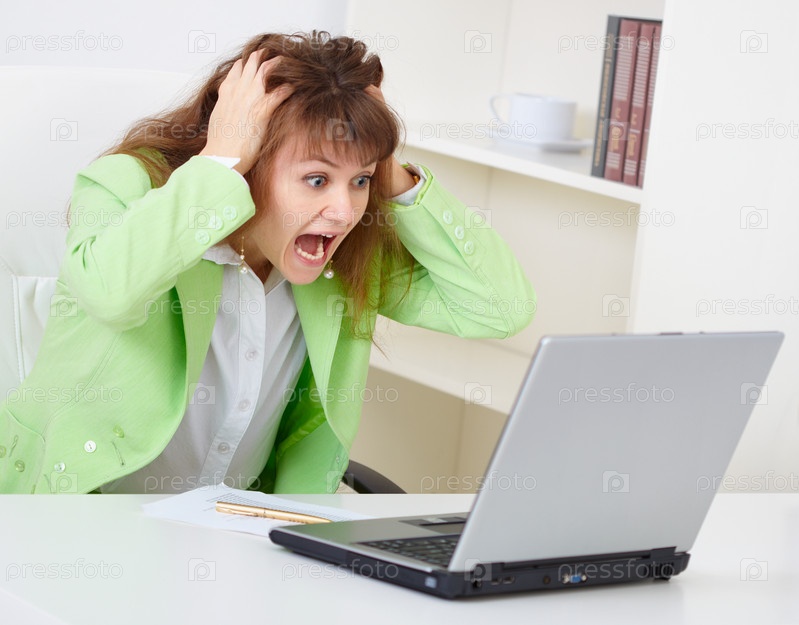 Женщина - начальник серьезно смотрит на нас, сидящих на рабочем месте
