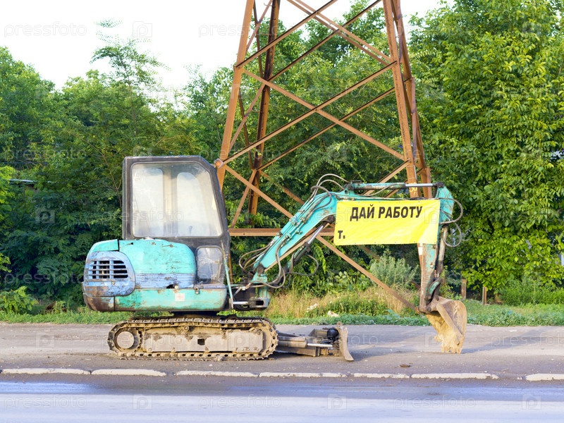 Экскаватор на обочине с объявлением на ковше