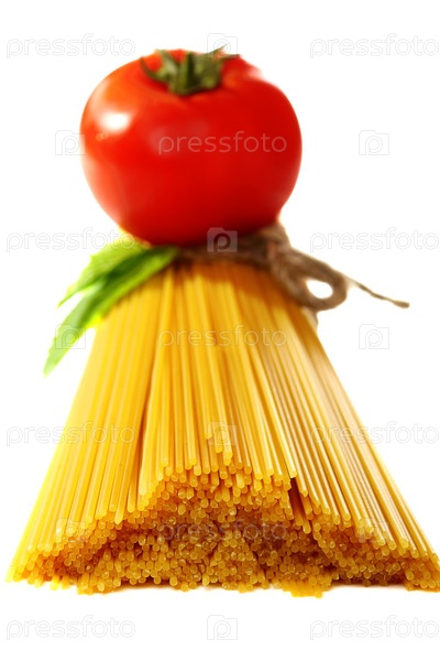 Свежий помидор, лежащий на длинных макаронах на белом фоне