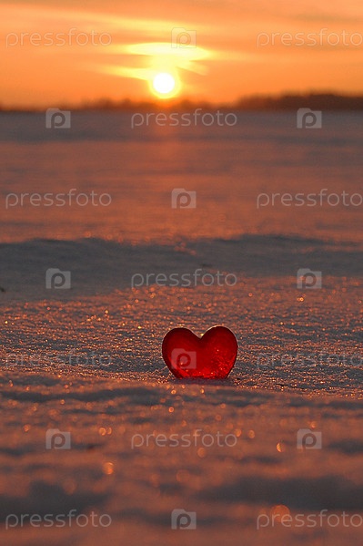 Красное сердце в снегу на закате