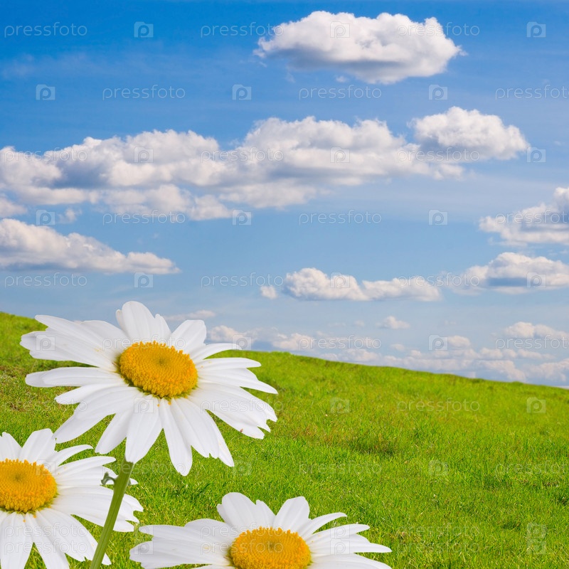 Ромашки на поляне на фоне голубого неба