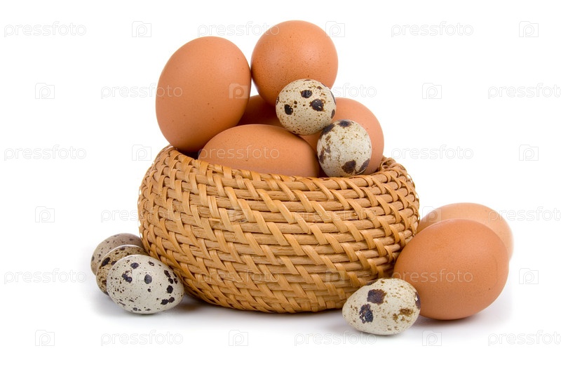 Куриные и перепелиные яйца в корзинке на белом фоне