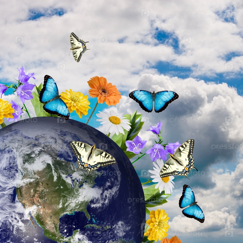 Цветы и бабочки вокруг Земного шара на фоне неба