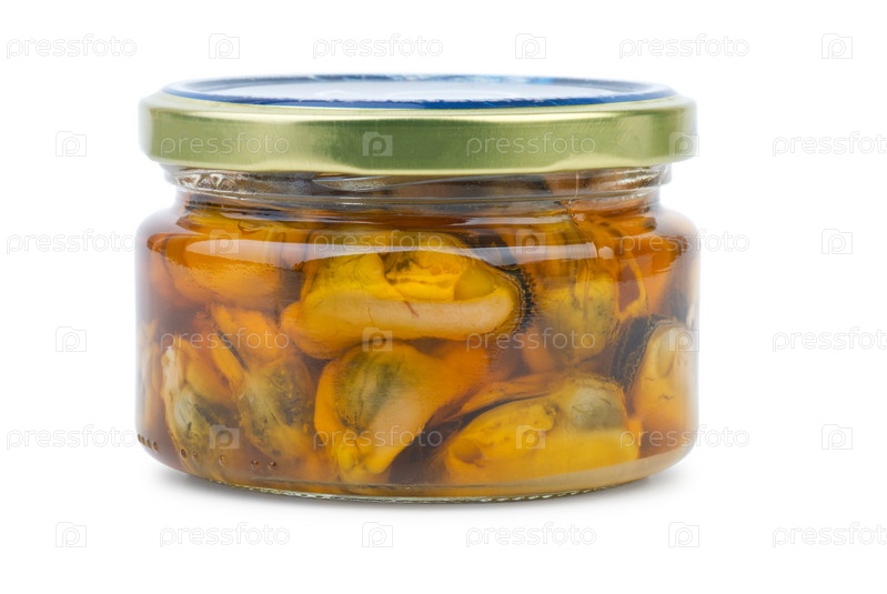 Стеклянная банка с консервированными мидиями на белом фоне