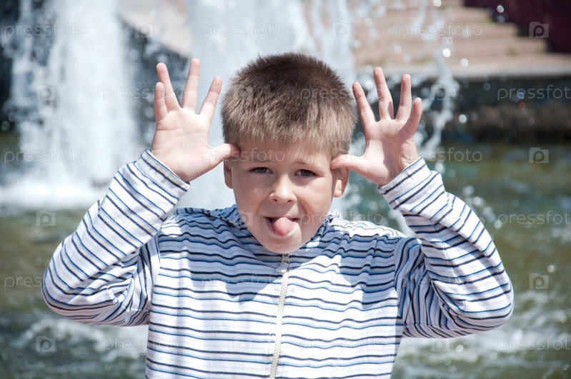 Кривляющийся мальчик на фоне фонтана