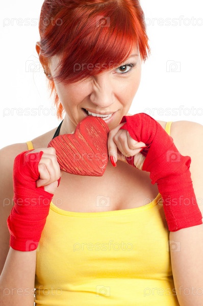 Игривая девушка с красным деревянным сердечком, изолированная на белом фоне