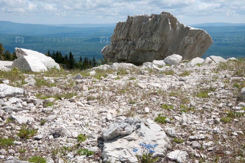 Кварцитовые останцы на горном плато, хребет Зюраткуль, Южный Урал