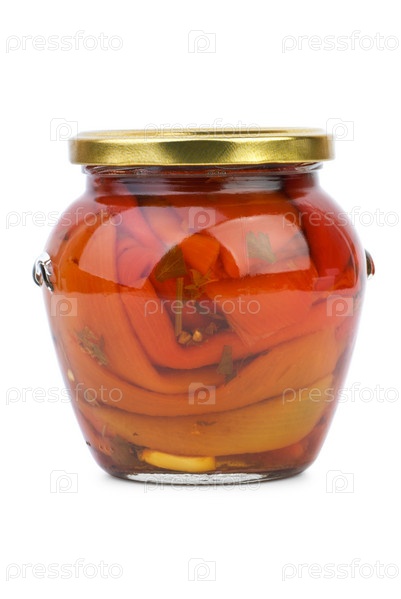 Стеклянная банка с консервированным болгарским перцем на белом фоне